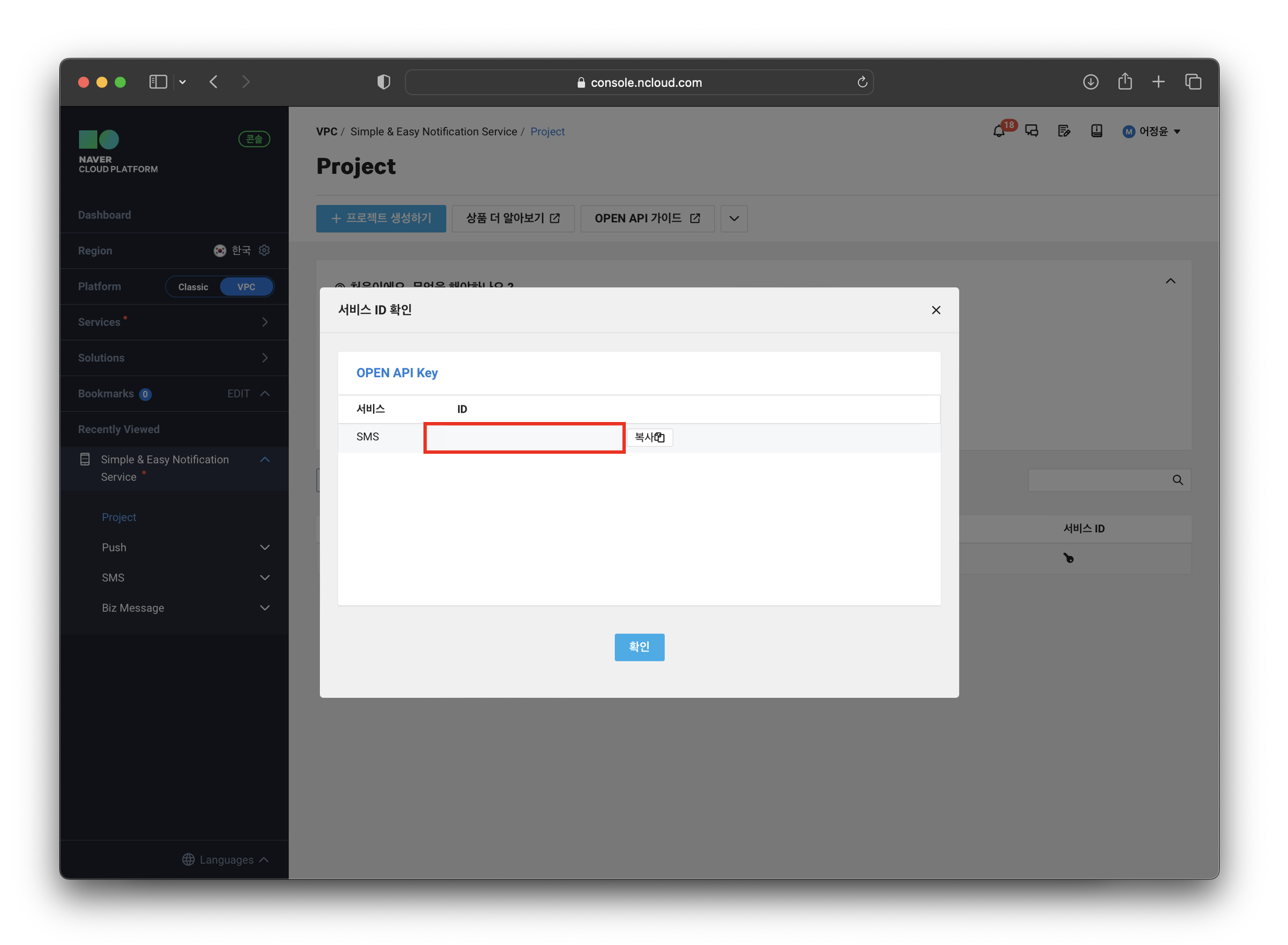 - Project > 발신번호 등록할 프로젝트 ‘SMS’ 선택