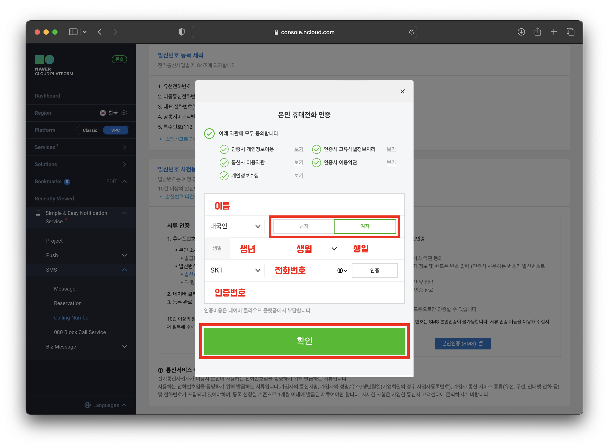 - 본인 휴대전화 인증 > 확인