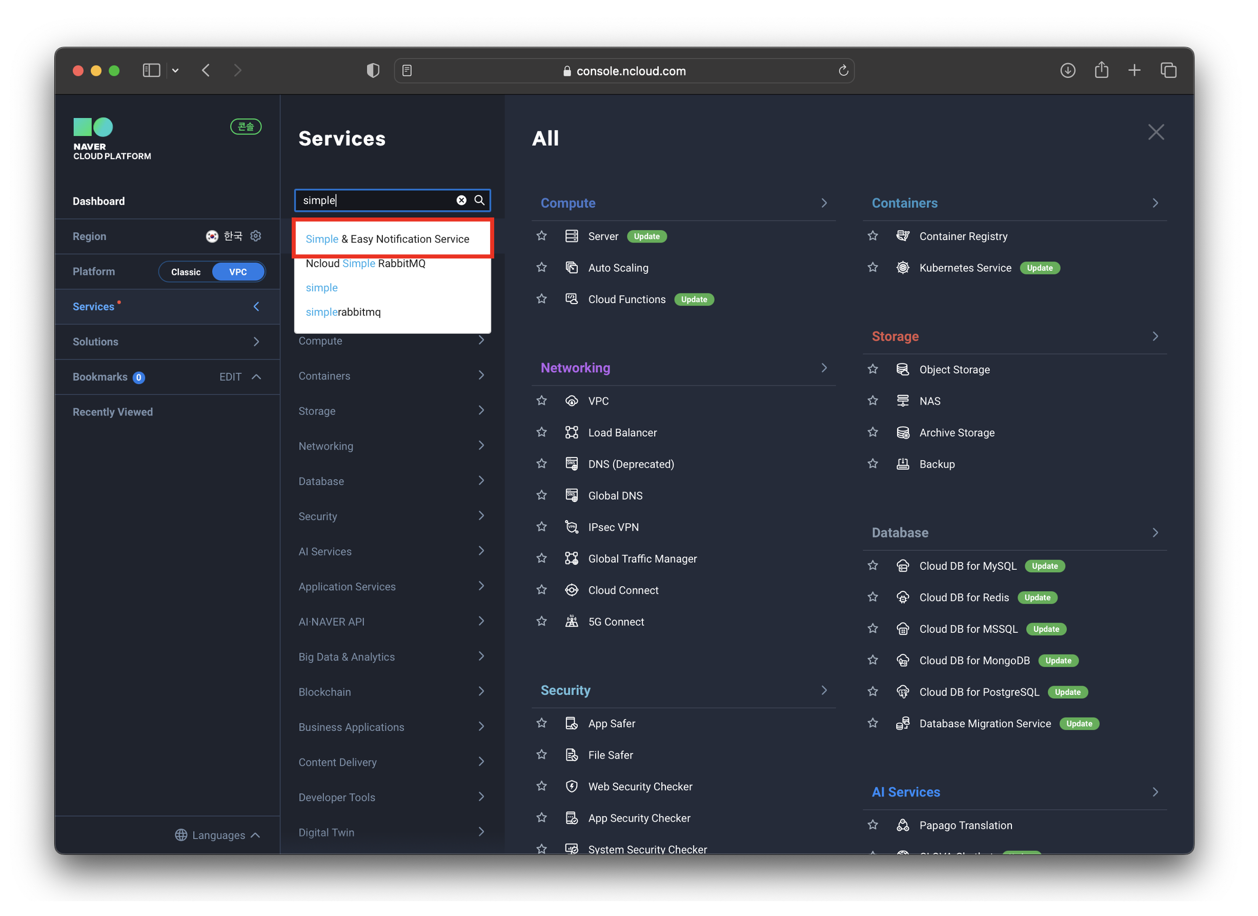 - 콘솔 > Services > ‘Simple & Easy Notification Service’ 선택
