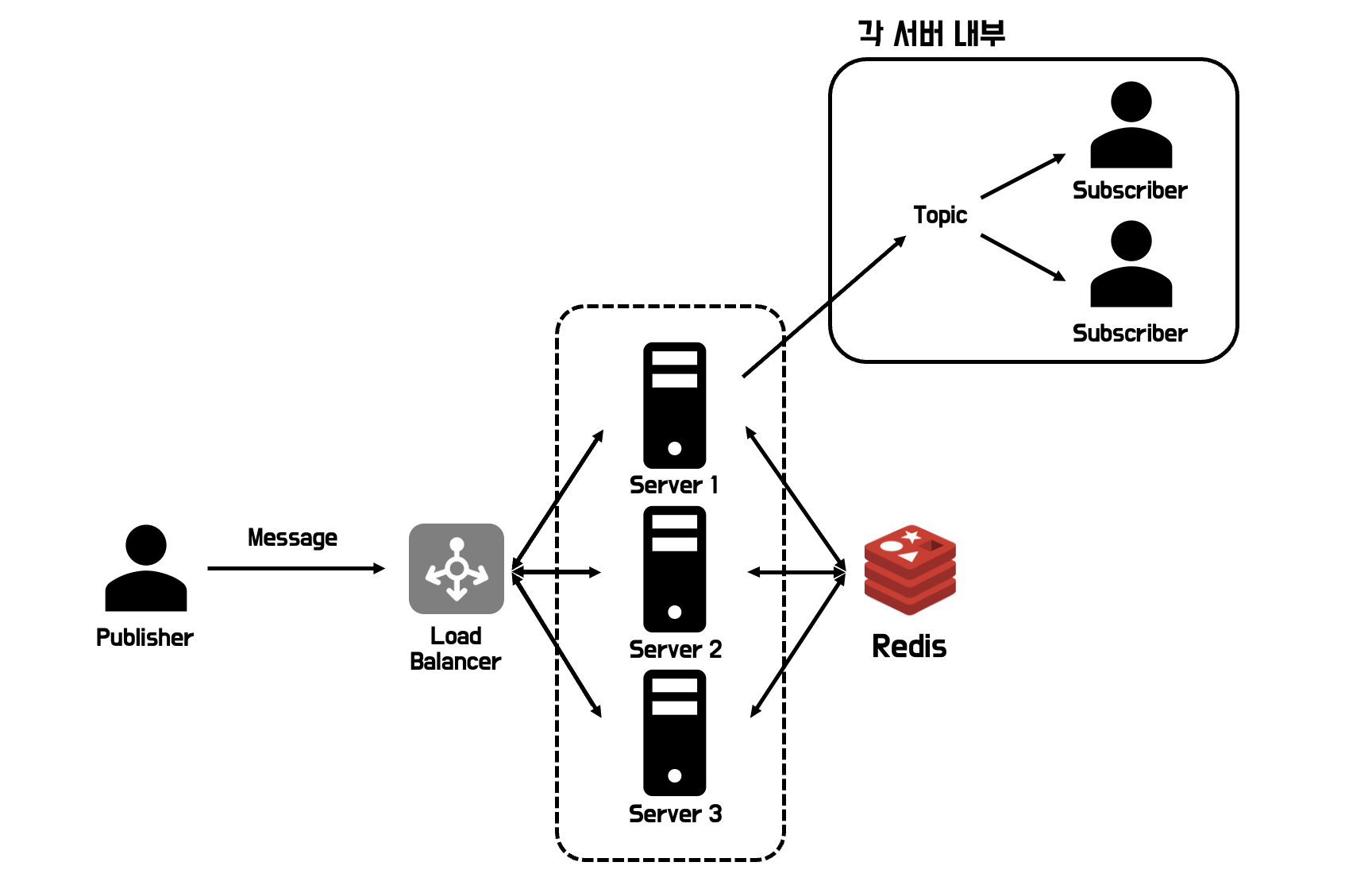 - 채팅방에 대한 Topic을 구독 중인 다른 서버(Server 1, Server 2, Server 3)의 RedisSubscriber에서 메시지를 받으면 내부 메시지 브로커로 Subscriber들에게 메시지를 발행한다.