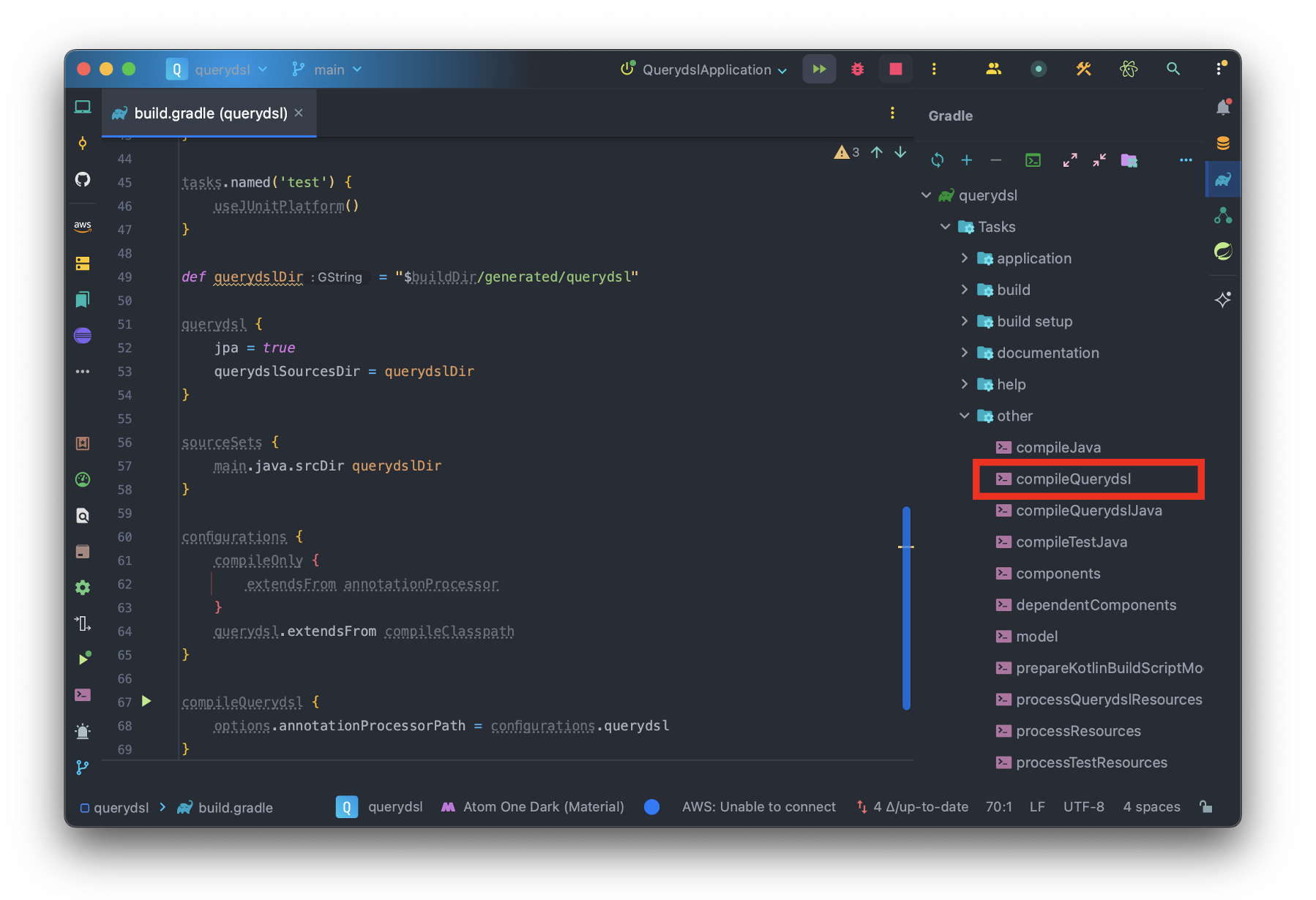 gradle 변경사항 반영 후 IDE 좌측 Gradle > {프로젝트명} > Tasks > other > compileQuerydsl 실행