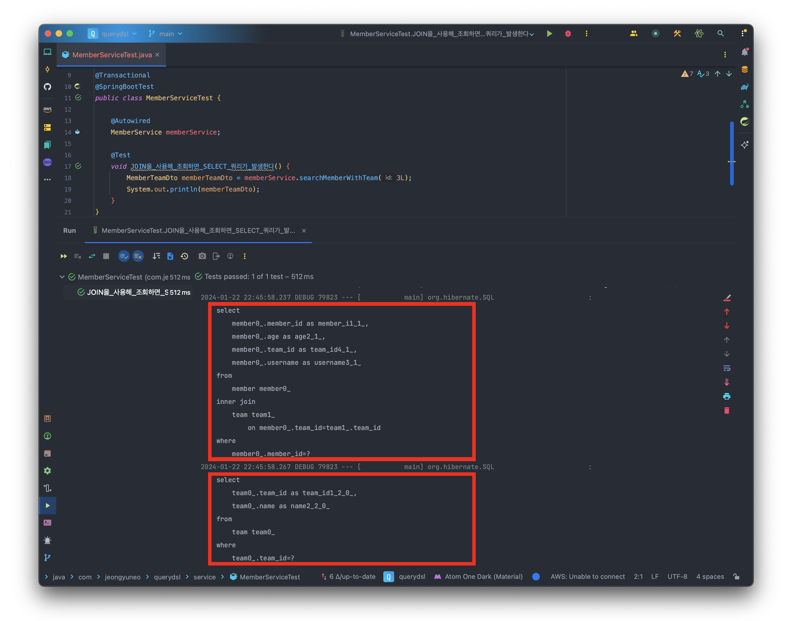 fetchJoin을 사용하면 FetchType이 Lazy인 엔티티를 참조해도 이미 영속성 컨텍스트에 저장된 상태이기 때문에 아래와 같이 SELECT문이 나가지 않는 것을 확인할 수 있다.